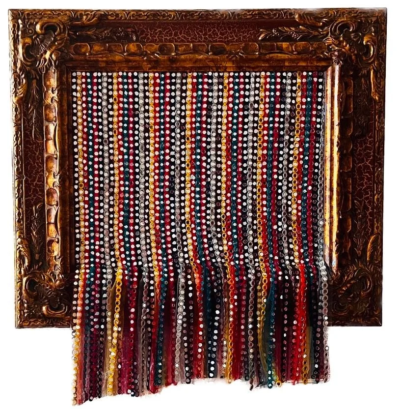 Description: A tactile piece, Wonder exudes excitement and joy of color, fabric, and the reflective nature of mirrors. Neon and metallic colors elevate the pleasure and glamour of South Asian textiles.