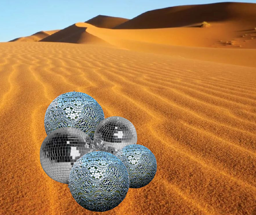 Description: Using the artist’s Desi Disco ball pieces, this installation concept blends South Asian and Arabian rugs and sand to envoke an traditional ambience juxtaposed with flashy and contemporary disco aesthetic, highlighting the unintuitive yet agreeable blend of the two styles.