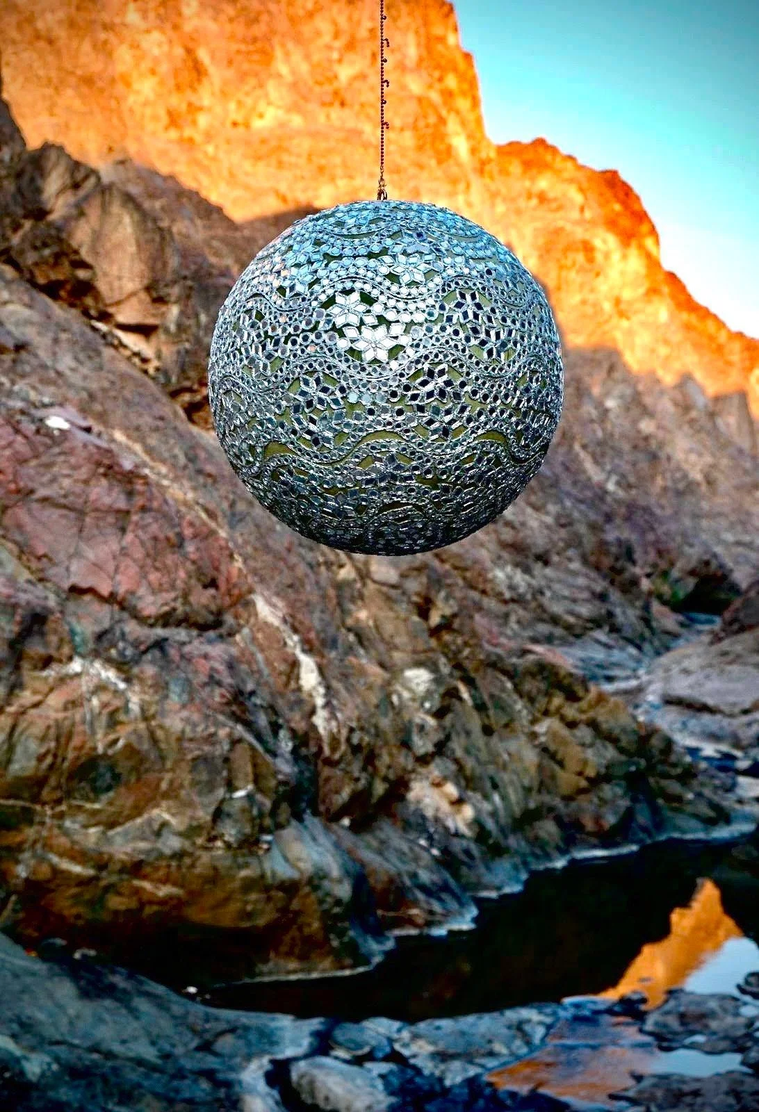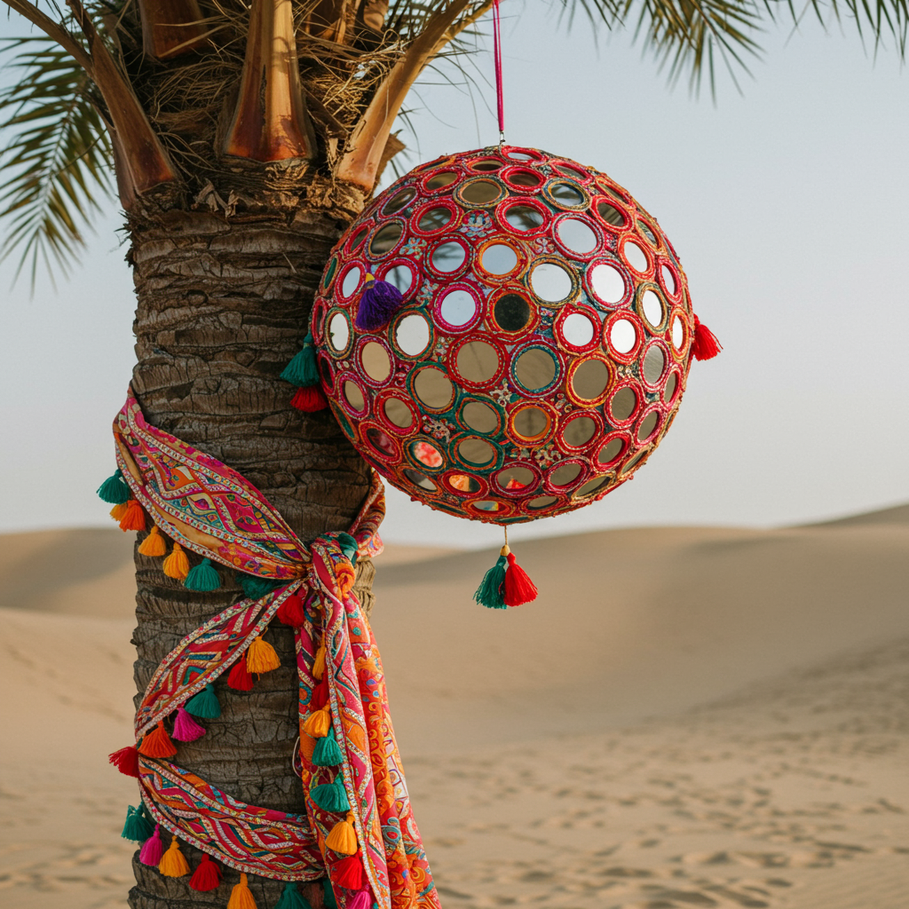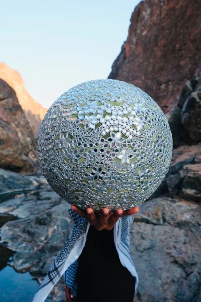 Description: Disco balls are a symbol of glamor and nightlife, and these Desi Discoballs are a fresh take on the originals, using South Asian embroidered mirrors, fashioning them, by hand, into an adapted fusion concept of a beloved symbol of festivity. The series includes multiple versions with varying sizes and designs. Setup concepts include displays in the desert and forest. The idea is to take a decolonized approach to disco, dance, and pleasure. All pieces were created between 2022-2024.