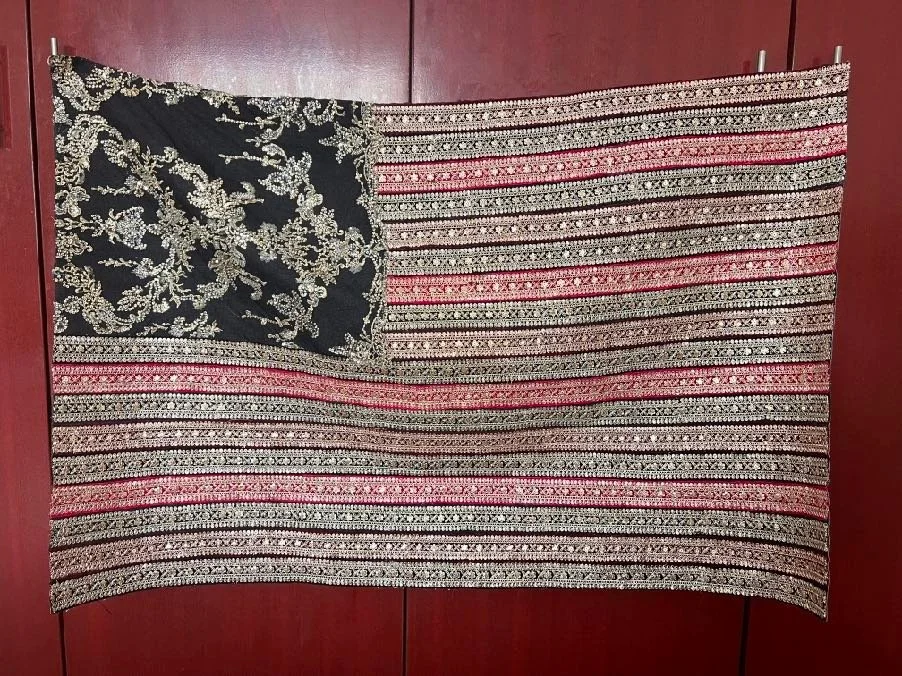 Description: This flag piece, made with Pakistani textiles, and embroidered lace, represents the immigrant experience - with the United States provided a foundation to Pakistani families, and those families bringing the beauty of their culture to America, yet this fusion can often be challenging and conflicting, so the use of dark colors are meant to represent this heaviness, despite the obvious and innate beauty.